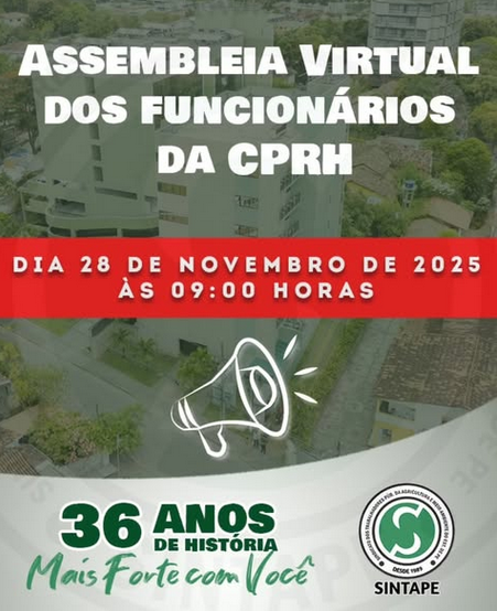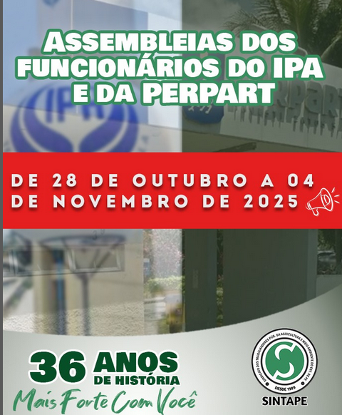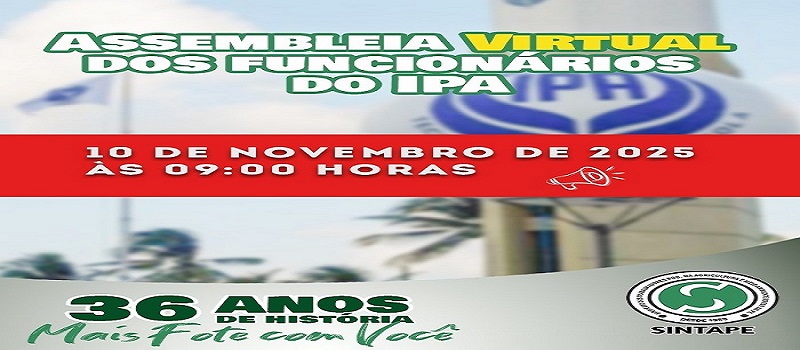 O SINTAPE convoca os empregados públicos do Instituto Agronômico de Pernambuco (IPA), a fim de participarem da Assembleia Virtual no dia 10 de novembro de 2025, às 09:00 horas em primeira convocaç[...]